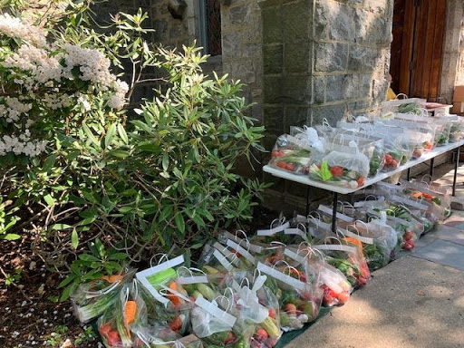 Welcome! Volunteers prepared these bags of fresh produce, the first stop for pantry clients.