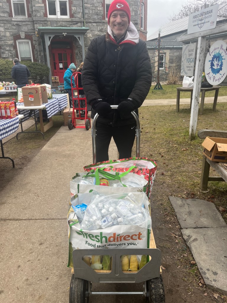 Volunteer John Prendergast hauls a donation from Zion Episcopal Church that included smile-inducing coffee.