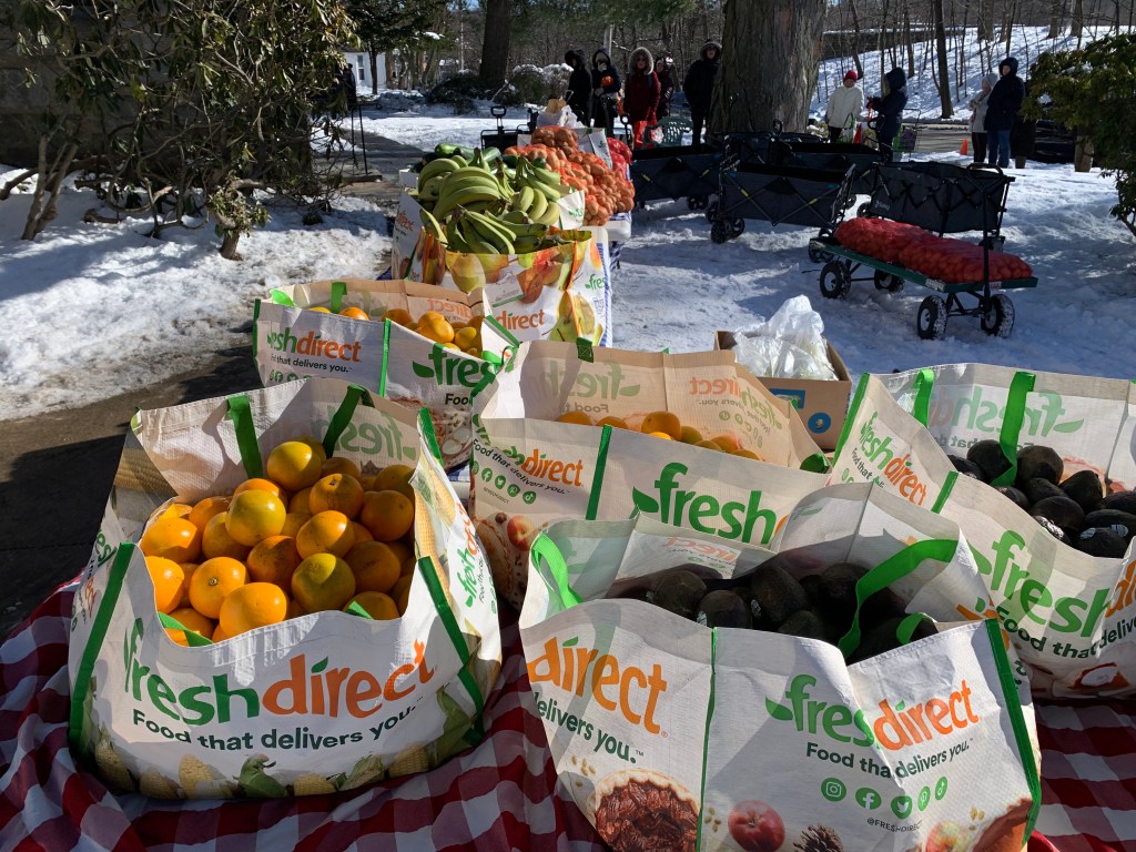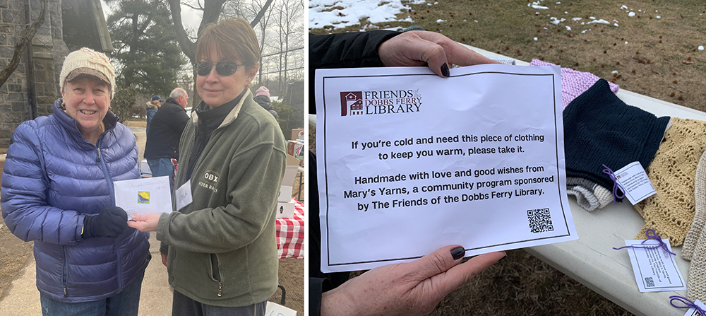 Mary’s Yarns, a community program sponsored by the Friends of the Dobbs Ferry Library, a nonprofit, filled a table with handmade scarves on a chilly morning. So beautiful and cozy. And thank you to The Scarsdale Woman’s Club for their continued support. Here’s Rosemary (left) with Vera Halpenny, pantry co-director, dropping off much needed Stop & Shop gift cards.