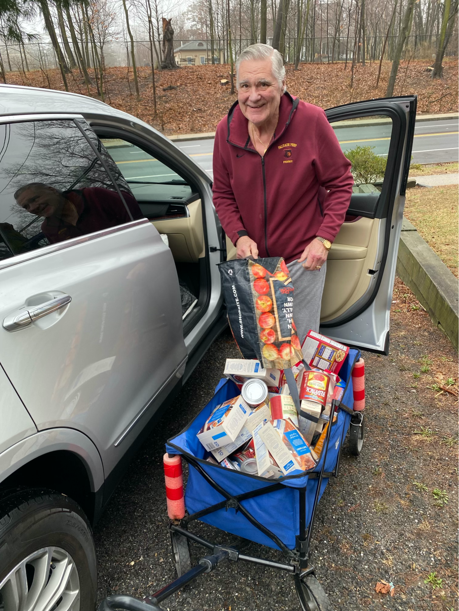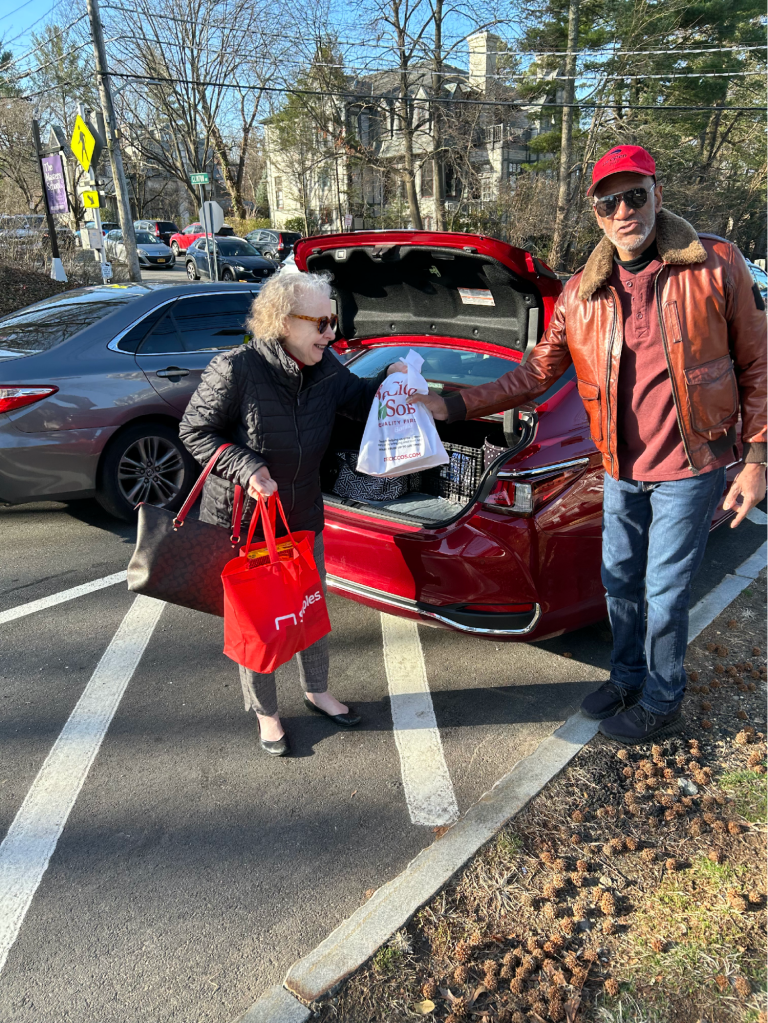 Virginia of The Scarsdale Woman’s Club, a longtime donor, hands Andrew Smith, a longtime volunteer, a bag from a car loaded with food.