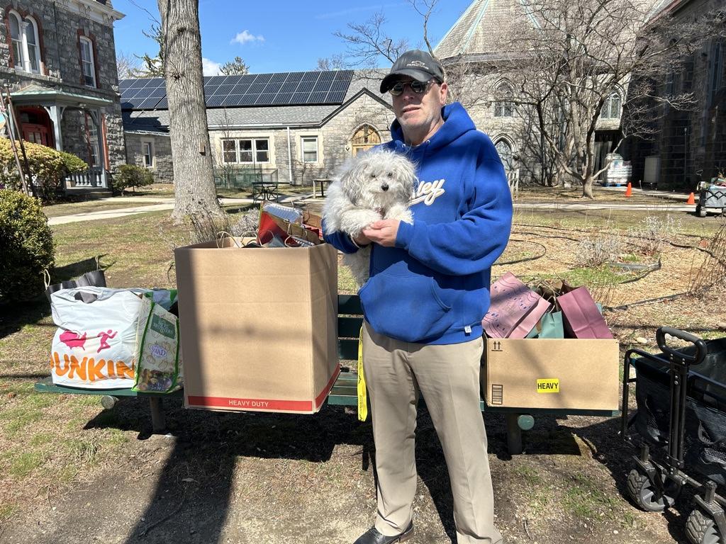 Craig and a furry friend brought 125 birthday bags to the pantry, a donation from Ardsley High School students. The bags contained everything needed to make and decorate a cake.